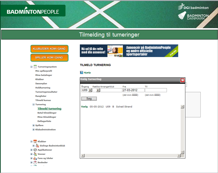 Først skal turneringen findes. På illustrationen nedenunder vises filteret hvori man fremsøger den ønskede turnering.