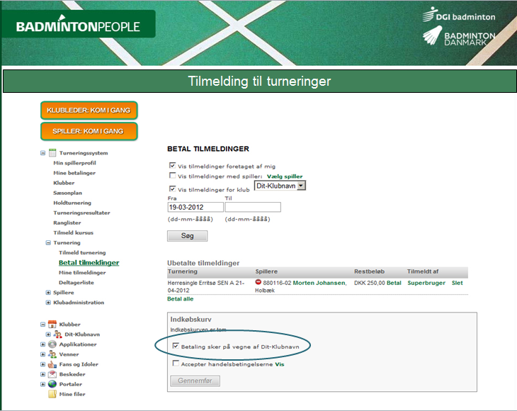 Ved betaling af turnering, kan hvis klubben tillader det. vælges mellem betaling af klubben. Ellers udføres betaling via kreditkort