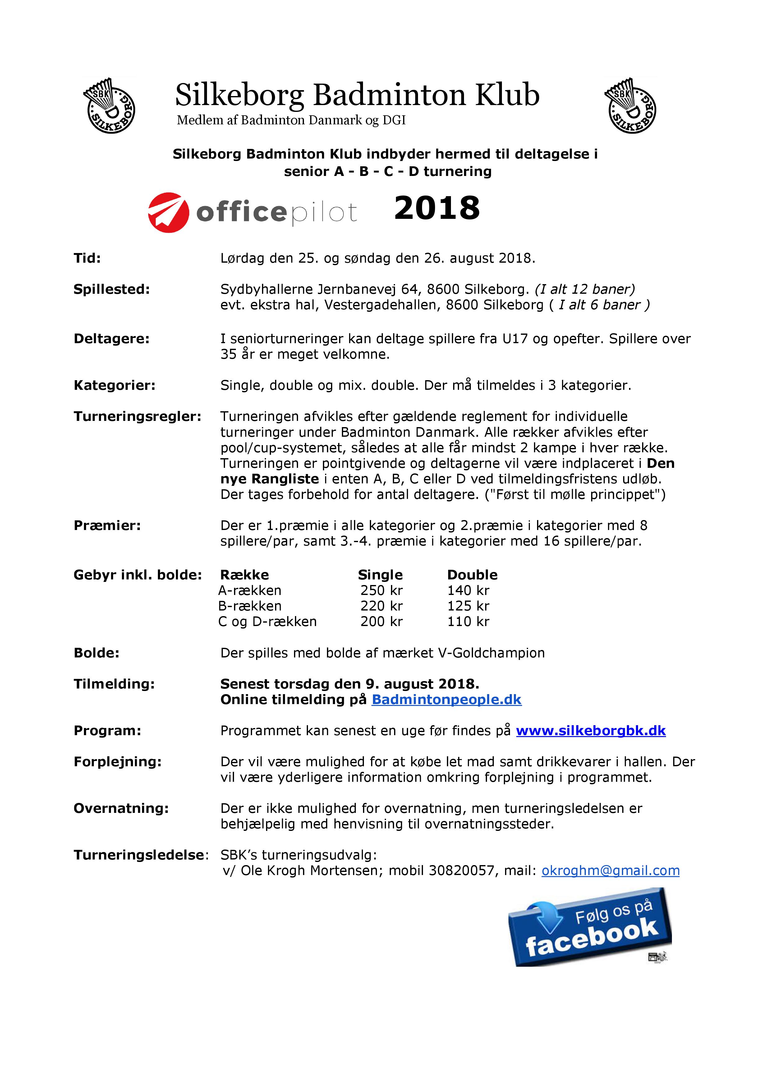 Vi kickstarter badmintonsæsonen 18/19 i Silkeborg med en åben A, B, C og D seniorturnering 25. og 26. august 2018, hvor også spillere over 35 år ( veteraner ) er meget velkommen.